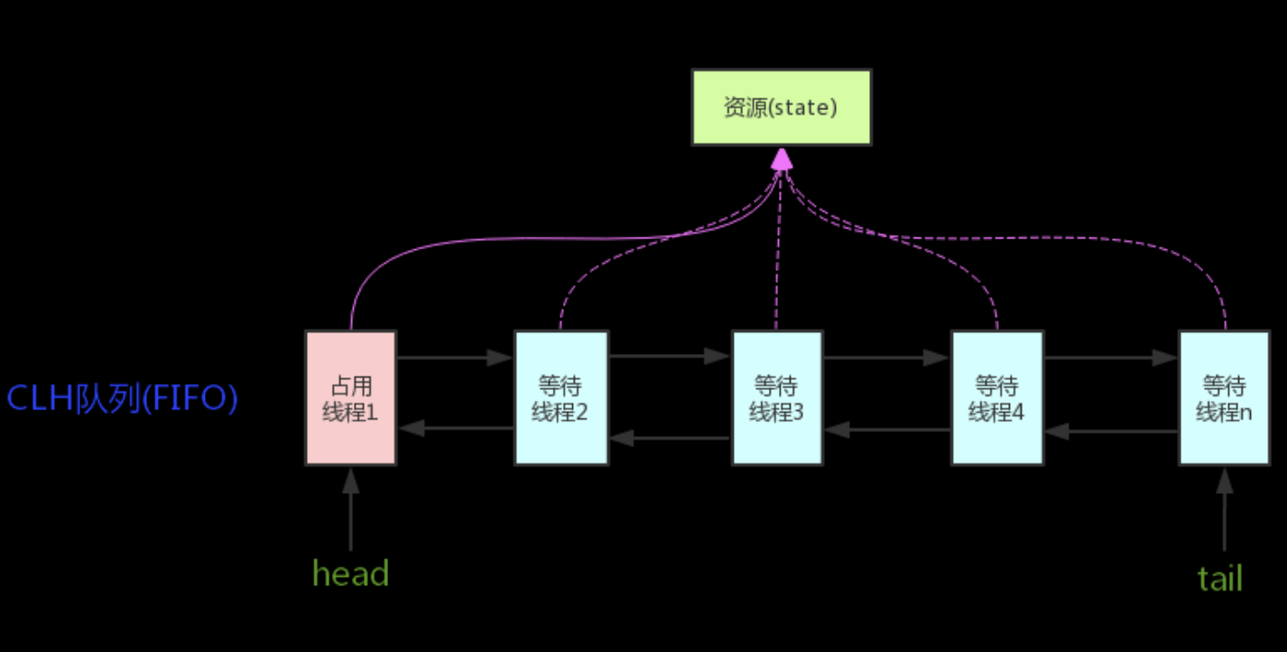 CLH(Craig,Landin,and Hagersten)队列是一个虚拟的双向队列(虚拟的双向队列即不存在队列实例,仅存在结点之间的关联关系)。AQS 是将每条请求共享资源的线程封装成一个 CLH 锁队列的一个结点(Node)来实现锁的分配。