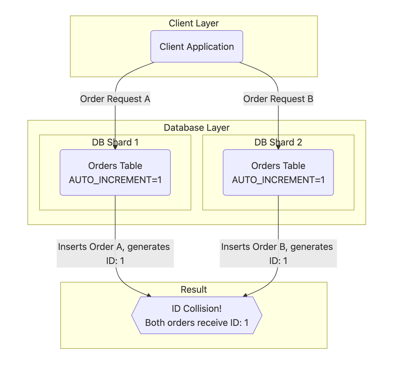 However, in modern distributed and microservices architectures, systems are often partitioned to handle high concurrency and massive data volumes. This means that data for a single business entity, such as “orders,” is spread across multiple database instances or tables. In such a scenario, if each shard independently uses its own AUTO_INCREMENT mechanism, ID collisions become inevitable, as illustrated below: